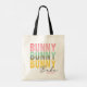 Les sacs à provisions personnalisés Lapin Bébé Mignon Moderne Féminin Pâques présentent le texte moderne "Lapin Lapin Lapin Bébé" en typographie rose, turquoise et jaune et personnalisés avec votre nom en modifiant le texte dans la zone de texte fournie. Conçu par ©Evco Holidays www.zazzle.com/store/evcoholidays