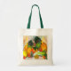 Légumes aux couleurs vives avec quelques feuilles d'automne et des fleurs avec un imprimé d'ombre de légumes dans l'arrière - plan. Rappelez-vous, amis ou proches, d'acheter beaucoup de légumes de couleur vive pour donner un coup de pouce à leur santé, avec ce sac coloré!