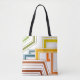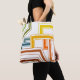 Ce sac fourre-tout est décoré dans un style art déco avec des lignes en vert, jaune, marron, orange et bleu.
