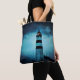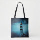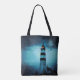 Le thème nautique et maritime, un sac fourre-tout estival ! Un phare une nuit orageuse bleu foncé avec nuages et pluie. On peut voir une lumière dans la tour du phare. Image bleu foncé.
