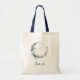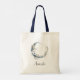 Sac fourre-tout avec une illustration mystique. Une lune bleu foncé avec un contour élégant en cercle mince et des fleurs blanches fleurissent le long de ses bords.