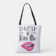 Ce sac fourre-tout branché kiss me présente un dessin d'une paire de lèvres de dessin animé magenta et la légende Shut up & Kiss Me dans une police moderne noire sur un arrière - plan blanc clair.