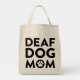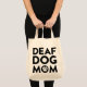 Le texte noir "Deaf Dog Mom" est empilé en trois lignes de texte en majuscules. Le "o" dans "Mom" a une patte blanche à l'intérieur.