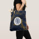 Sac fourre-tout avec un élégant et élégant arrière - plan de marbre bleu marine et or. Couché sur le dessus est un cercle avec une fausse bordure en feuille d'or avec votre monogramme personnalisé à l'intérieur.