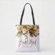 Sac fourre-tout rustique moderne de demoiselle d'honneur avec automne de l'or orange rouillé et des fleurs de crème d'ivoire avec feuilles séchés et feuillage et un script de typographie chic et fantaisiste. +++++++++++++++ Personnalisez-le avec son nom sur le devant et avec les noms des couples mariages et la date sur le verso.