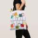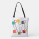 Ce sac fourre-tout au design moderne du milieu du siècle ressemble à un mobile avec des carrés solides et ouverts accrochés à celui-ci en turquoise, orange, vert, rouge et beige.