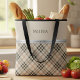Upgrade your daily carryall with this sophisticated Beige and Charcoal Plaid Tote Bag. Perfectly blending the "Modern Farmhouse" aesthetic with "Quiet Luxury," this tote features a crisp horizontal split design. The top section, in a clean minimalist beige, showcases your personalized name in a timeless serif font, while the bottom features a classic diagonal plaid pattern in tan and deep charcoal tones. A sleek black line at the top provides a designer finish that perfectly anchors the sturdy black handles. Whether you're heading to the farmer's market, the library, or the office, this durable and stylish bag is designed for versatility. It makes a thoughtful, high-end gift for birthdays, teachers, or bridesmaids. Personalize it today to add a touch of understated elegance to your wardrobe.