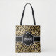 Sac fourre-tout empreinte de léopard en or et noir chic avec un nom personnalisé et un modèle monogramme. Un motif poster de animal de safari mignon et branché, arrière - plan surmonté d'un petit morceau de personnalisation.