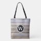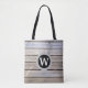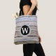 Vous aimerez ce sac fourre-tout de plage rustique mais moderne et tendance à l'aspect en bois monogrammé ! Lettre monogramme blanc en cercles noirs et gris et un motif arrière - plan de lattes de bois.