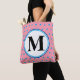 Pois bleus réversible sur arrière - plan noir rose. Personnalisez avec votre initiale monogrammée en texte noir sur le devant du sac à l'intérieur du cercle blanc. Joli sac de mode féminin géométrique. Conception originale © TamiraZDesigns. www.zazzle.com/tamirazdesigns