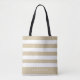 Motif à rayures beige et blanches de soja tendance, sac fourre-tout. Personnalisez avec le nom et le titre de la fête de mariage.