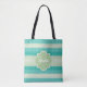 Un sac fourre-tout motif rayé turquoise et lacy vert clair et tendance. Personnalisez ce design tricoté élégant en ajoutant votre nom et votre monogramme. Il fait partie de la collection Arcadia Knit Motif With Nile Green Monogram Collection. Image imprimée plate, NON faite avec du fil tricoté ou de la dentelle.