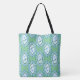Un très joli Sac fourre-tout, avec un motif de motifs de fleurs Periwinkle bleus sur le blanc, dans un hexagone décoratif, le tout sur un arrière - plan vert clair. Faisant partie de la collection Posh and Painterly 'Periwinkle Patch', ce motif s'adapte à n'importe quel Sac fourre-tout et peut être customisé en faisant tourner le motif ou en changeant l'échelle pour un look très différent.