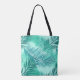 Sac fourre-tout imprimé dans une impression tropicale de silhouettes en feuilles de palmier qui se chevauchent, dans les tons turquoise / paon et turquoise, contre un arrière - plan aqua léger