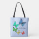 Beau papillons multicolores sur Sac fourre-tout bleu clair. Le texte peut être personnalisé. Des femmes élégantes font des courses de sacs.