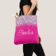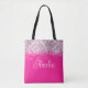 Créez votre propre sac fourre-tout personnalisé ou monogrammé sur toute l'impression avec un style de police de calligraphie moderne. Ce script curly a l'air super avec son prénom ou son initiale. Il y a d'autres styles de police à choisir. La parties scintillant en argent est un design art numérique qui s'imprime comme une photo. Customisez l'arrière - plan rose chaud pour qu'il corresponde à sa couleur préférée.