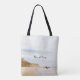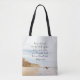 citations inspirantes Écriture sac fourre-tout personnalisé représente une simple photographie de la nature avec ciel bleu, une plage de sable de l'océan et la formation de rochers. Il présente la Bible Verse Philippiens 1:6, "Etant confiant de cela, que Dieu qui a commencé un bon travail en vous le complétera jusqu'au jour de Jésus-Christ." Photo Zach Camp. Customisé le dos avec un nom ou des détails de votre choix._
