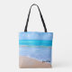 Un sac fourre-tout avec la photo d'une scène océanique bleu clair avec des vagues douces le long d'un bord de mer et du sable brun doux. Un ciel bleu avec des nuages moelleux au loin. Un cadre tropical idyllique serein. Personnalisez avec un nom.