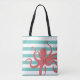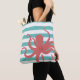 Ce sac fourre-tout moderne branché de style plage abrite une pieuvre rouge contre un arrière - plan rayé blanc et turquoise.