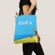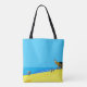 Ce sac fourre-tout d'épaule est personnalisé avec votre nom. Il présente une photo d'art numérique de Benaulim Beach à Goa, en Inde. L'imprimé est stylisé et montre la vaste plage de jaune vif contre une mer et un ciel bleu turquoise. La proue d'un bateau local accroché aux perles est à droite et vous pouvez voir des vaches et des cyclistes sur la plage. Les couleurs principales sont le sable jaune et le bleu turquoise clair du ciel. Choisissez parmi des tailles moyennes ou grandes.