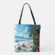 Un joli sac fourre-tout tropical agrémenté d'une belle plage plantée de palmiers, de fleurs tropicales, d'eau bleue et de poteries qui s'élancent jusqu'au rivage. Un sac de plage personnalisé auquel vous pouvez ajouter un nom.