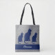 Tout sur sac fourre-tout à motifs avec pois gris sur gris foncé et trois chats bleu marine avec bande bleu marine où vous pouvez ajouter un nom facilement avant de commander!