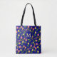 Pretty personalized tote bag with a feminine floral pattern on a dark blue background.