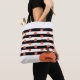 This simple and modern Halloween themed tote bag features a white and black striped pattern with small orange pumpkins, and a large pumpkin in the front corner where you can add a personalized name. A perfect gift for October holidays or autumn birthdays!