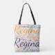 Regina. Montrez et portez ce populaire beau prénom féminin conçu comme un nuage de mots coloré fait de lettrage à main horizontale et verticale dans différentes tailles et des couleurs fraîches adorables. Portez votre nom américain positif ou montrez au monde que vous aimez ou adorez. Merch avec cette oeuvre d'art en texte souple est un grand cadeau, pas seulement dans le mois de l'histoire des femmes, ou cadeau d'anniversaire.