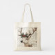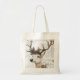 Ce sac fourre-tout festif présente une illustration rustique d'un renne avec une couronne de pin et de baies rouges sur ses bois. L'arrière - plan a un look vintage et texturé avec un script manuscrit. Parfait pour ajouter une touche de vacances confortable à vos cadeaux.
