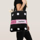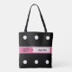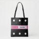 Personnalisez ce sac pour que les enfants puissent porter leurs livres scolaires ou de bibliothèque. Ajoutez un nom et changez le texte si vous préférez. Conçu en noir, points blancs, bande rose et clip papier. 'Livres scolaires.' sur le devant 'Jours scolaires=Jours heureux' sur le dos.