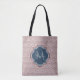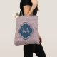 Un élégant sac fourre-tout de motif à pétoncle en arc d'art rouge foncé avec un badge bleu marine en quatrefoil, que vous pouvez personnaliser en ajoutant facilement votre propre monogramme et nom. Cela fait partie de la collection de printemps de pétoncles de pomme épicé Sailor Blue Monogram.