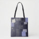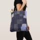 Sac fourre-tout bleu foncé avec design traditionnel japonais sashiko imprimé qui ressemble à des points de suture et des patchs.