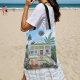 Appréciez le style ensoleillé où que vous alliez avec ce sac fourre-tout animé de maison de plage! Présentant un chalet vert mousse de mer, des planches de surf et des palmiers balançants, ce tourniquet côtier apporte des vibrations de plage décontractées à votre routine quotidienne. Idéal pour les jours de plage, les courses de marché, ou comme sac quotidien pour les amoureux de l'océan qui veulent emporter un peu de la côte avec eux.