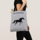 Silhouette de cheval noir et élégant sur Sac fourre-tout gris argenté. Le texte peut être personnalisé. Les chevaux symbolisent la force spirituelle de la nature.