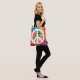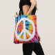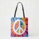 Un sac fourre-tout vibrant avec un signe de paix audacieux dressé contre un arrière - plan tourbillonnant teint cravate. Le mélange de blues vives, d'oranges enflammées, de violets profonds et de jaunes ensoleillés crée un design animé et attrayant, parfait pour répandre positivité et paix dans le style.