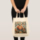 Trick ou traiter le sac fourre-tout d'achat pour les provisions d'automne et Halloween. Parfait pour un cadeau et collectionner "Trick ou friandises". L'oeuvre est composée de citrouilles de chute, de feuillage de chute dans un décor bohème. Le texte peut être facilement personnalisé avec l'outil et les scripts de Zazzle.