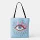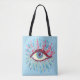 Oeil psychédélique sur tout le sac fourre-tout imprimé avec une illustration colorée d'un oeil bleu bizarre avec de gros cils rose cailloutés, des larmes bleu clair coulant partout et de nombreux éléments rose et vert - extensions des cils.