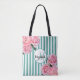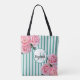 Tote Bag Turquoise rayures blanches fleures roses monogramm