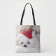 Sac fourre-tout avec une adorable photo d'un mignon chien blanc portant un casquette de noël rouge.