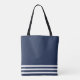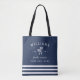 Commémorez vos vacances en famille, votre voyage ou votre croisière avec ces sacs fourre-tout personnalisés uniques. Parfait pour les plaisirs de la plage et des voyages essentiels, notre design personnalisé comprend des rayures bleu marine et blanc classiques avec votre nom de famille, type d'événement, année et destination flanquant une paire d'illustrations silhouettes de palmiers blancs.