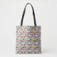 Ce sac fourre-tout a un design moderne du milieu du siècle d'une grille de lignes noires avec des carrés et des rectangles aux couleurs rétro sur un champ de blanc.