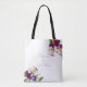 Ce sac fourre-tout romantique de conservation mariage présente un design floral. L'arrière - plan est un blanc simple et élégant avec des violettes d'aquarelle violette. Un délicat bouquet de fleurs violettes est représenté en haut à gauche, avec les noms du couple imprimés ci-dessous.
