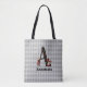 Whimsical Wonderland themed women's tote bag features vintage Alice and the Queen of Hearts character color illustrations with large letter / initial 'A' with a card suite fill on muted grey harlequin background. Personalize with name