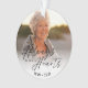 Rappelez-vous et chérissez votre être aimé avec ce ornement photo mémorial personnalisé. Le design comprend une mise en page complète des photos pour afficher votre propre photo spéciale. "Always In Our Hearts" est présenté dans la calligraphie blanche moderne avec l'année née et l'année passée.