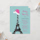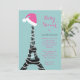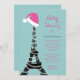 Un chapeau de Père Noël rose vif et des lumières scintillantes décorent la Tour Eiffel sur cette invitation baby shower d'inspiration hivernale parisienne, parisienne, pour le baby shower à thème girly, Paris, Parisien, hiver, Noël, vacances, romantique ou Marie Antoinette.