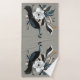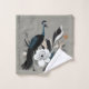Un paon noir saisissant entouré de fleurs blanches et beiges douces, accentué de feuilles noires audacieuses qui font écho à sa présence dramatique.