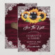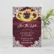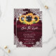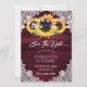 Mariage floral rustique bourguignon sauvegarder les cartes datant des tournesols sur un arrière - plan en bois orné de dentelle fleurie blanche et de lampes à cordes. Éléments correspondants disponibles.