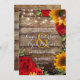 Sunflower & Rose Rustic Wood Lights Invitation avec tournesol jaune, roses rouges et souffle bébé. Un arrière - plan en bois rustique avec des lumières scintillantes au-dessus et un design cardiaque cursif. Idéal pour ce pays d'automne ou mariage de grange. Produits correspondants disponibles.