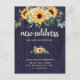 Cette nouvelle carte postale rustique présente de jolis tournesols aquarelle dans les tons colorés de jaune et d'or, avec des feuilles verts, et la typographie décontractée sur un bleu marine, le bois look arrière - plan. Vous pouvez ajouter un message personnel à l'arrière. La façon idéale de faire savoir à vos amis et à votre famille que vous avez déménagé.